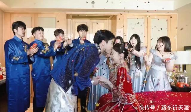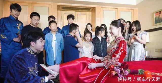 还有接亲现场照,在伴郎伴娘的起哄下,嘉仔拉着细君双手,俯身亲吻她额头。