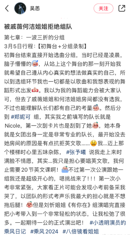 当最新一期节目更新后,吴恙姐姐在酬酢账号发出音尘,她默示初舞台限度就奏凯运行选曲分组,因为仍是录制到凌晨,是以脑子是懵懵的,在选歌组队的进程中,她认为我方的跳舞实力会被环球招供,但去了戚薇姐姐和何洁姐姐的房间,这两位姐姐齐莫得选我方,但她默示清晰,因为每位队长齐有各自的考量。